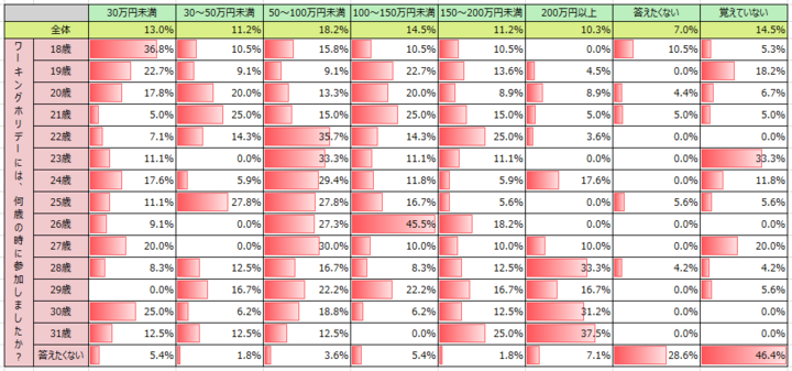 「ワーキングホリデーには、どれくらいの予算で行きましたか?(学費や用意していた生活費なども含む)」という質問に対して、「30万円未満」と回答したのは渡航時の年齢19歳が22.7%、渡航時の年齢18歳では36.8%と、他の年齢層と比べて高い回答数となりました。