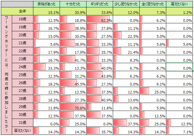 「準備したワーキングホリデーの予算は、十分でしたか?」という質問に対しては、全体の33.6%が「ギリギリだった」と回答しました。